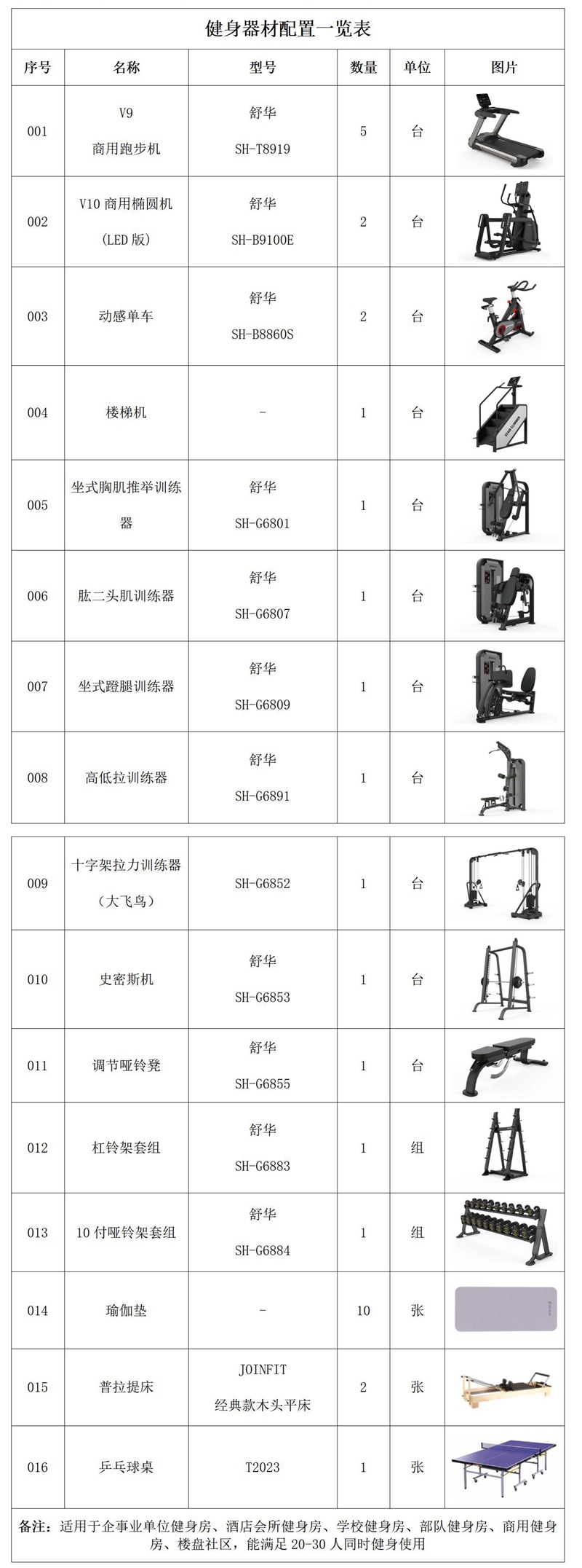 此方案要求面积小于220平米,适用于企事业单位健身房、酒店会所健身房、学校健身房、部队健身房、商用健身房、楼盘社区,能满足20-30人同时健身使用。