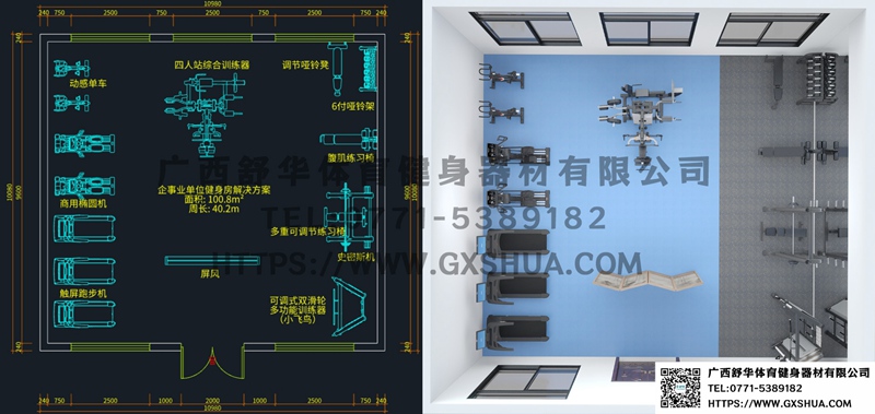 此方案要求面积小于101m²,适用于企事业单位、酒店会所、楼盘社区、工作室、学校等健身场所,能满15-20人同时健身使用。(方案根据场地空间大小、预算、产品需求等进行配置仅为启发性参考,可根据企业实际情况和员工需求,对设计方案进行调整和优化)