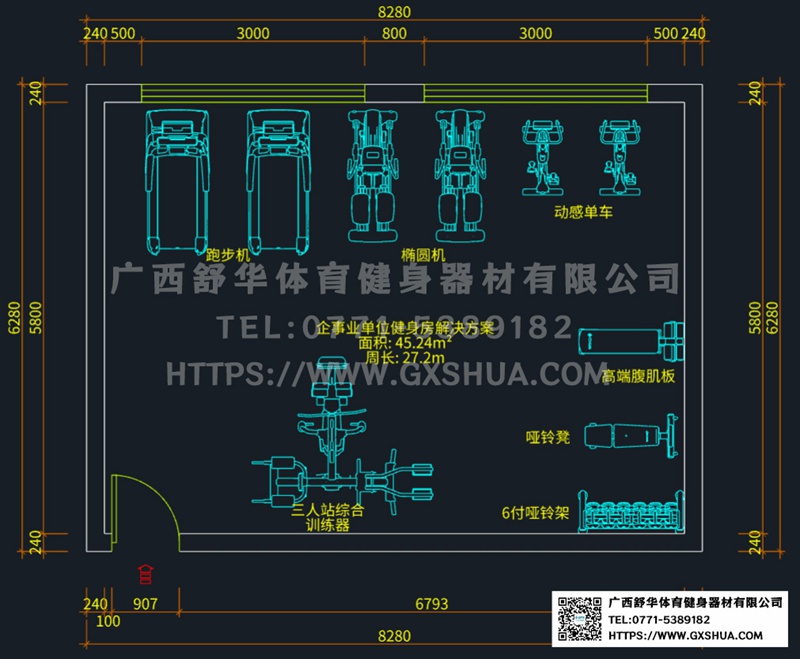史密斯机(1台),多重可调节练习椅(1台),背部伸展练习器(1台),腹肌板(1台),6付哑铃套组(1套),哑铃凳(1张),可以实现对不同肌肉群的针对性训练,满足肌肉训练需求,全方位激活身体机能。