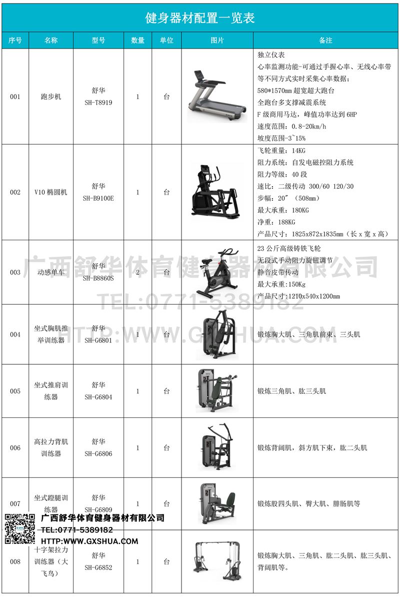 1.球王会V9跑步机SH-T8919*4台-580*1570mm超宽超大跑台-跑感舒适,跑台整体安全稳定;全跑台多支撑减震平台,保证跑台超强支撑力,达到180kg支撑,满足专业健身房需求。F级商用马达-超强马达,AC 3.0HP 交流,峰值功率达到6HP,F级商用品质。速度范围达到0.8-20km/h;V9跑步机可实现跑台扬升功能,坡度范围-3~15%,满足客户不同的锻炼需求。
