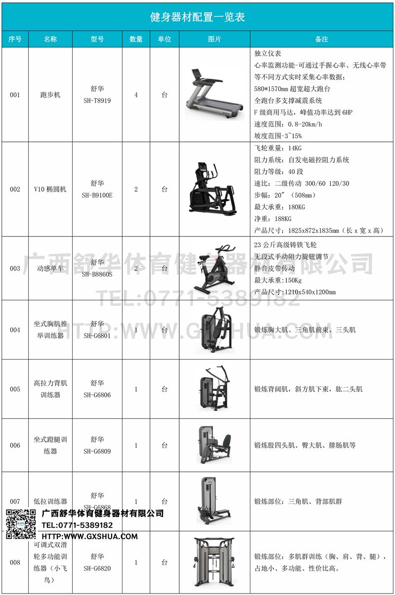1.球王会V9跑步机SH-T8919*4台-580*1570mm超宽超大跑台-跑感舒适,跑台整体安全稳定;全跑台多支撑减震平台,保证跑台超强支撑力,达到180kg支撑,满足专业健身房需求。F级商用马达-超强马达,AC 3.0HP 交流,峰值功率达到6HP,F级商用品质。速度范围达到0.8-20km/h;V9跑步机可实现跑台扬升功能,坡度范围-3~15%,满足客户不同的锻炼需求。