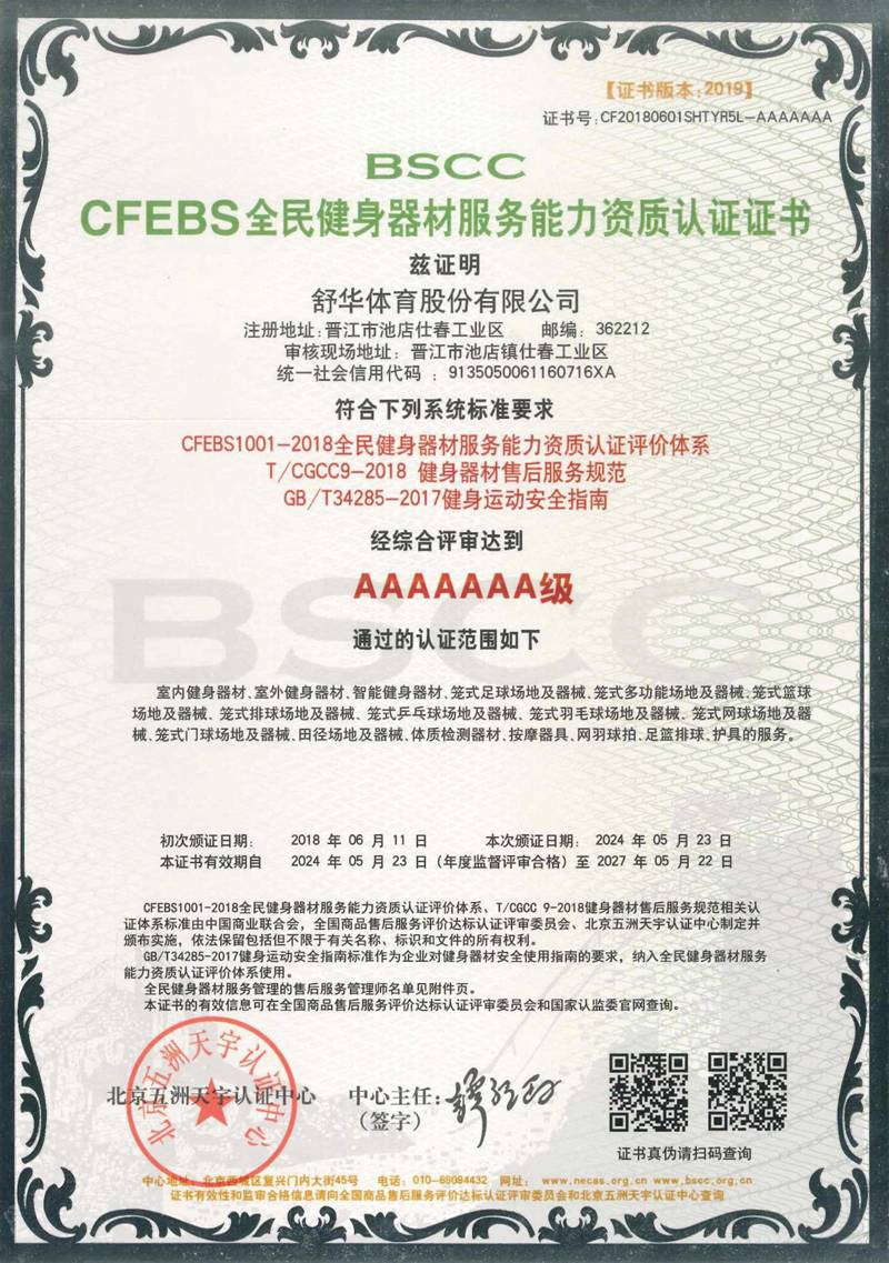 球王会以用户满意作为服务追求,凭借专业的技术能力及服务保障能力、有效的售后服务体系,获得“BSCC-CFEBS 全民健身器材服务能力资质认证证书 AAAAAAA 级”,部分员工经培训考试合格并获得“BSCC-CFEBS 全民健身器材服务能力资质认证证书-售后服务高级管理师(AAAAAA 级)。