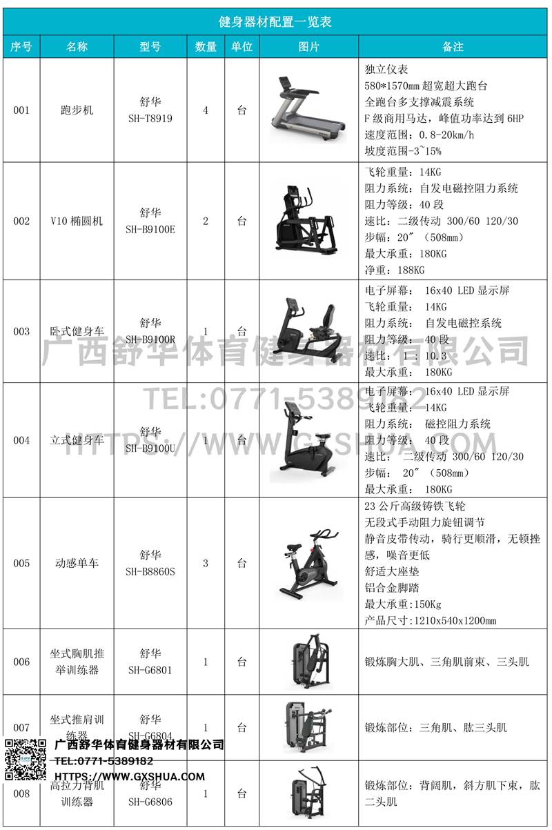 1.球王会V9跑步机SH-T8919*4台-独立仪表-简洁大气,全新外观设计,健康运动新选择;心率监测功能,可通过手握心率、无线心率带等不同方式实时采集心率数据;580*1570mm超宽超大跑台-跑感舒适,跑台整体安全稳定;全跑台多支撑减震平台,保证跑台超强支撑力,达到180kg支撑,满足专业健身房需求。F级商用马达-超强马达,AC 3.0HP 交流,峰值功率达到6HP,F级商用品质。速度范围达到0.8-20km/h;V9跑步机可实现跑台扬升功能,坡度范围-3~15%,满足客户不同的锻炼需求。